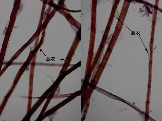 在200 倍鏡下,可觀察到構皮纖維具有明顯的細胞腔,但細胞腔大小不一。細胞壁上的橫節紋愈加明顯清晰,紋理深淺各異,大多數橫節紋跟纖維橫切面約成15~20°的夾角。部分纖維細胞的外壁包裹有一層透明膜,稱為膠衣(如圖3),一般多呈斷續狀,并會隨著纖維被處理程度的加重而減少,有些甚至被剝離成碎片飄散于纖維之間,在纖維的端部膠衣相對比較明顯。